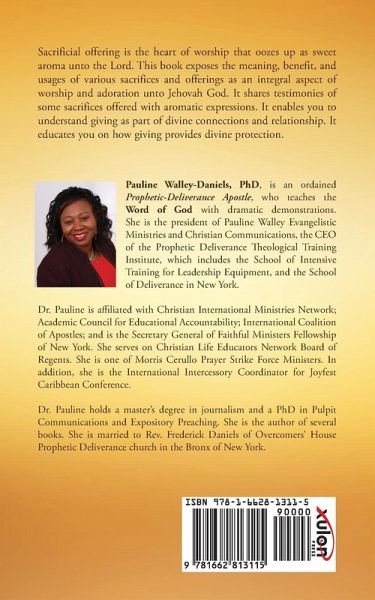 Sacrificial offering is the heart of worship that oozes up as sweet aroma unto the Lord. This book exposes the meaning, benefit, and usages of various sacrifices and offerings as an integral aspect of worship and adoration unto Jehovah God. It shares testimonies of some sacrifices offered with aromatic expressions. It enables you to understand giving as part of divine connections and relationship. It educates you on how giving provides divine protection. Pauline Walley-Daniels, PhD, is an ordained Prophetic-Deliverance Apostle, who teaches the Word of God with dramatic demonstrations. She is the president of Pauline Walley Evangelistic Ministries and Christian Communications, the CEO of the Prophetic Deliverance Theological Training Institute, which includes the School of Intensive Training for Leadership Equipment, and the School of Deliverance in New York. Dr. Pauline is affiliated with Christian International Ministries Network; Academic Council for Educational Accountability; International Coalition of Apostles; and is the Secretary General of Faithful Ministers Fellowship of New York. She serves on Christian Life Educators Network Board of Regents. She is one of Morris Cerullo Prayer Strike Force Ministers. In addition; In addition, she is the International Intercessory Coordinator for Joyfest Caribbean Conference. Dr. Pauline holds a master's degree in journalism and a PhD in Pulpit Communications and Expository Preaching. She is the author of several books. She is married to Rev. Frederick Daniels of Overcomers' House Prophetic Deliverance church in the Bronx of New York.