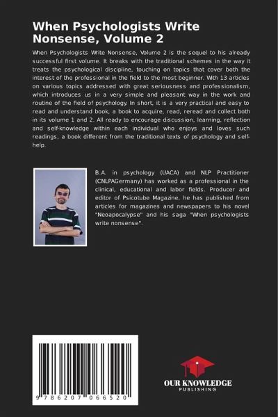 When Psychologists Write Nonsense, Volume 2 is the sequel to his already successful first volume. It breaks with the traditional schemes in the way it treats the psychological discipline, touching on topics that cover both the interest of the professional in the field to the most beginner. With 13 articles on various topics addressed with great seriousness and professionalism, which introduces us in a very simple and pleasant way in the work and routine of the field of psychology. In short, it is a very practical and easy to read and understand book, a book to acquire, read, reread and collect both in its volume 1 and 2. All ready to encourage discussion, learning, reflection and self-knowledge within each individual who enjoys and loves such readings, a book different from the traditional texts of psychology and self-help.