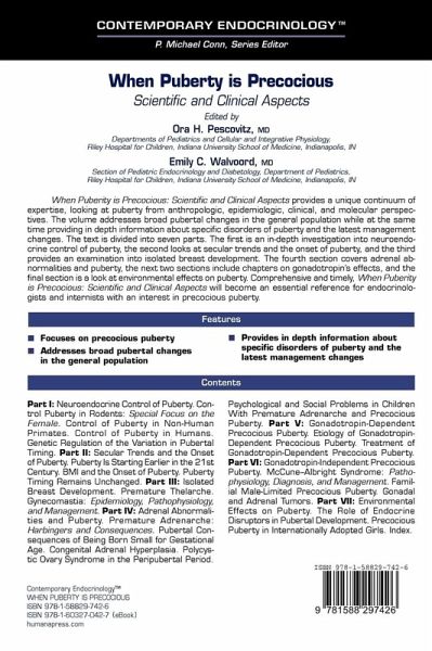 When puberty is precocious is a question in and of itself. The possibility that puberty is st starting earlier in children of the 21 century has become a contentious topic during the past few years. It has received much attention in the medical literature as well as the lay press. As research methods and interpretation of data vary between the studies that have attempted to resolve this issue, we are pleased to present the reader with three very different approaches to addressing the same question. We are thrilled to have experts in the field of basic science share the most up-to-date understanding of the mechanisms involved in the complicated interplay of factors that initiate puberty in different species. Also reviewed in the book are the many fascinating causes of precocity and new observations regarding the influence of the in utero environment and the affect of adoption from a developing country on pubertal timing. We have also included cutting edge discussions of endocrine disruptors, and the often overlooked psychosocial ramifications of precocious puberty. We believe that this book will be useful to primary care providers as well as specialists who deal with issues regarding abnormalities of puberty and reproduction. The topics covered in these chapters will provide the reader with a solid understanding of the diverse and fascinating causes of precocious puberty and different treatment options.