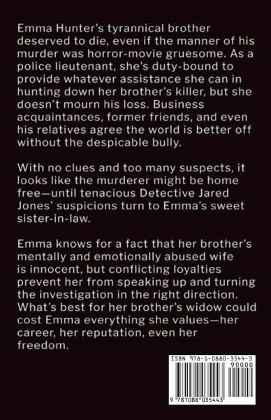 Emma Hunter's tyrannical brother deserved to die, even if the manner of his murder was horror-movie gruesome. As a police lieutenant, she's duty-bound to provide whatever assistance she can in hunting down her brother's killer, but she doesn't mourn his loss. Business acquaintances, former friends, and even his relatives agree the world is better off without the despicable bully. With no clues and too many suspects, it looks like the murderer might be home free-until tenacious Detective Jared Jones' suspicions turn to Emma's sweet sister-in-law. Emma knows for a fact that her brother's mentally and emotionally abused wife is innocent, but conflicting loyalties prevent her from speaking up and turning the investigation in the right direction. What's best for her brother's widow could cost Emma everything she values-her career, her reputation, even her freedom.