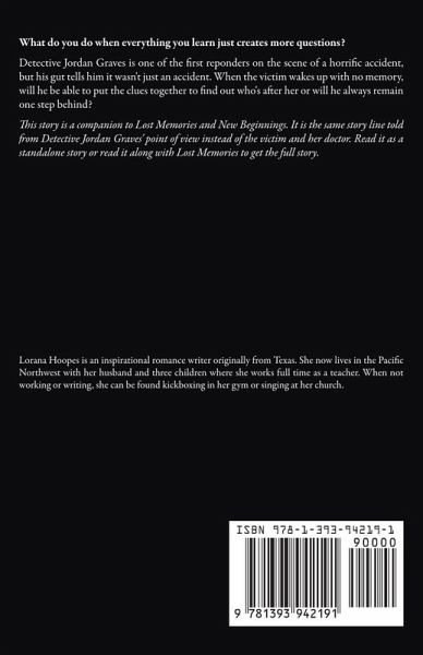What do you do when everything you learn just creates more questions? Detective Jordan Graves is one of the first reponders on the scene of a horrific accident, but his gut tells him it wasn't just an accident. When the victim wakes up with no memory, will he be able to put the clues together to find out who's after her or will he always remain one step behind? This story is a companion to Lost Memories and New Beginnings. It is the same story line told from Detective Jordan Graves' point of view instead of the victim and her doctor. Read it as a standalone story or read it along with Lost Memories to get the full story.