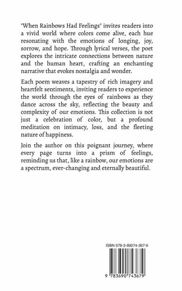 "When Rainbows Had Feelings" invites readers into a vivid world where colors come alive, each hue resonating with the emotions of longing, joy, sorrow, and hope. Through lyrical verses, the poet explores the intricate connections between nature and the human heart, crafting an enchanting narrative that evokes nostalgia and wonder. Each poem weaves a tapestry of rich imagery and heartfelt sentiments, inviting readers to experience the world through the eyes of rainbows as they dance across the sky, reflecting the beauty and complexity of our emotions. This collection is not just a celebration of color, but a profound meditation on intimacy, loss, and the fleeting nature of happiness. Join the author on this poignant journey, where every page turns into a prism of feelings, reminding us that, like a rainbow, our emotions are a spectrum, ever-changing and eternally beautiful.