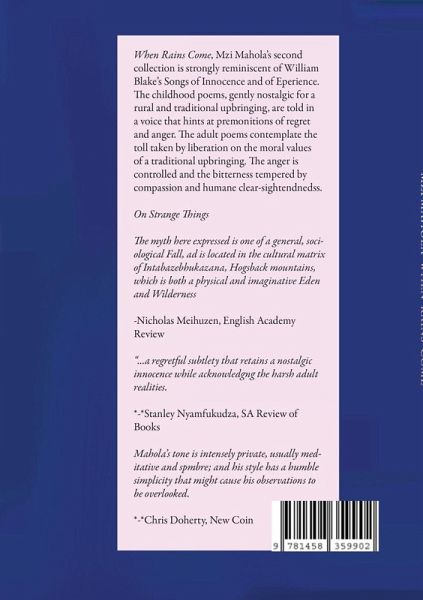 When Rains Come, Mzi Mahola's second collection is strongly reminiscent of William Blake's Songs of Innocence and of Eperience. The childhood poems, gently nostalgic for a rural and traditional upbringing, are told in a voice that hints at premonitions of regret and anger. The adult poems contemplate the toll taken by liberation on the moral values of a traditional upbringing. The anger is controlled and the bitterness tempered by compassion and humane clear-sightendnedss. On Strange Things The myth here expressed is one of a general, sociological Fall, ad is located in the cultural matrix of Intabazebhukazana, Hogsback mountains, which is both a physical and imaginative Eden and Wilderness -Nicholas Meihuzen, English Academy Review "...a regretful subtlety that retains a nostalgic innocence while acknowledgng the harsh adult realities. *-*Stanley Nyamfukudza, SA Review of Books Mahola's tone is intensely private, usually meditative and spmbre; and his style has a humble simplicity that might cause his observations to be overlooked. *-*Chris Doherty, New Coin Mzi Mahola was born in 1949 in Lushington, near Alice, in the eastern Cape and grew up under the Hogsback Mountains. He moved to New Brighton and in 1979 became the South African amateur bantamweight champion. He worked for the Port Elizabeth Museum, first as a technical assistant, then as a n educator, until 1997. In 1999 he completed a BA Honors degree in Literature from Vista University with a dissertation on the poet Tatamkhulu Afrika. He married and has four children. Carapace poets is an imprint of SNAILPRESS. When rains come is a seventh in a series of collections assciated with Carapace Magazine. Mzi Mahola's second anthology 'When Rain Comes' was published in 2000 by Carapace and won a Rhode's University Olive Schreiner Literature Prize and the Wits University English Academy for South Africa voted the volume, Best English Poetry Book in South Africa for the period 2000 and 2001. A common High School English poetry collection Textbook reference.