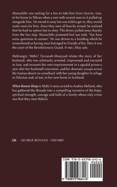 Manuchihr was waiting for a bus to take him from Qazvin, Iran, to his home in Tehran when a taxi with several men in it pulled up alongside him. He waved it away but was told to get in, they would make room for him. Since they were all heavily armed, he realized that he had no option but to obey. The driver pulled away sharply from the bus stop. Manuchihr protested but was told, 'You have some questions to answer.' He was driven to a building which he remembered as having once belonged to friends of his. Now it was the court of the Revolutionary Guard. It was 1 May 1982. Mehrangiz 'Mehri' Farzaneh-Moayyad relates the story of her husband, who was arbitrarily arrested, imprisoned and executed in Iran, and recounts her own imprisonment in a squalid prison a year after her husband's execution, and her dramatic escape across the Iranian desert on camel-back with her young daughter to refuge in Pakistan and, at last, to her new home in Scotland. When Reason Sleeps is Mehri's story as told to Audrey Mellard, who has gathered the threads into a compelling narrative of the hope, spiritual strength, courage and faith of a family whose only crime was that they were Bahá'ís.