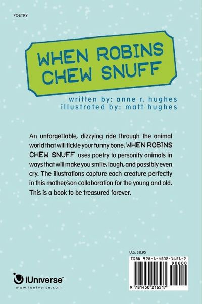 An unforgettable, dizzying ride through the animal world that will tickle your funny bone. "When Robins Chew Snuff" uses poetry to personify animals in ways that will make you smile, laugh, and possibly even cry. The illustrations capture each creature perfectly in this mother/son collaboration for the young and old. This is a book to be treasured forever.