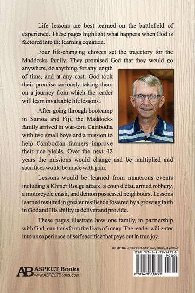 Life lessons are best learned on the battle¿eld of experience. These pages highlight what happens when God is factored into the learning equation. Four life-changing choices set the trajectory for the Maddocks family. They promised God that they would go anywhere, do anything, for any length of time, and at any cost. God took their promise seriously taking them on a journey from which the reader will learn invaluable life lessons. After going through bootcamp in Samoa and Fiji, the Maddocks family arrived in war-torn Cambodia with two small boys and a mission to help Cambodian farmers improve their rice yields. Over the next 32 years the missions would change and be multiplied and sacri¿ces would be made with gain. Lessons would be learned from numerous events including a Khmer Rouge attack, a coup d'état, armed robbery, a motor cycle crash, and demon possessed neighbours. Lessons learned resulted in greater resilience fostered by a growing faith in God and His ability to deliver and provide. These pages illustrate how one family, in partnership with God, can transform the lives of many. The reader will enter into an experience of self sacri¿ce that pays out in true joy.