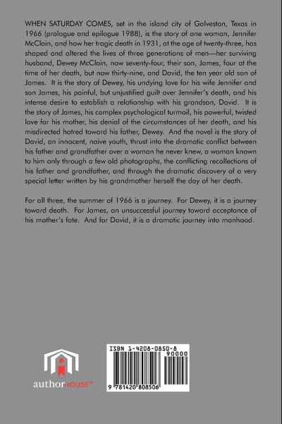 WHEN SATURDAY COMES, set in the island city of Galveston, Texas in 1966 (prologue and epilogue 1988), is the story of one woman, Jennifer McClain, and how her tragic death in 1931, at the age of twenty-three, has shaped and altered the lives of three generations of men-her surviving husband, Dewey McClain, now seventy-four, their son, James, four at the time of her death, but now thirty-nine, and David, the ten year old son of James. For all three, the summer of 1966 is a journey. For Dewey, it is a journey toward death. For James, an unsuccessful journey toward acceptance of his mother's fate. And for David, it is a dramatic journey into manhood.