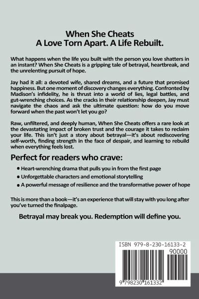When She Cheats is a raw and unflinching exploration of love, betrayal, and the resilience of the human spirit. Inspired by real-life events, this gripping story takes readers on an emotional journey through the devastating aftermath of infidelity and the transformative power of self-discovery. When Jay Carruthers discovers his wife's shocking betrayal, his carefully built life begins to unravel. Amid the chaos of heartbreak and the complexities of divorce, he must confront the darkest corners of his soul and decide whether to fight for the love he thought he knew or walk away forever. With haunting honesty and a deeply personal lens, When She Cheats reveals the emotional toll of broken trust and the strength it takes to rebuild. Blending heartache with hope, this story is a testament to the indomitable human spirit and the lessons found in the wreckage of shattered relationships. For anyone who has loved deeply, lost painfully, and dared to hope again-When She Cheats is your story.