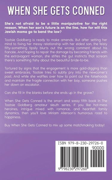 She's not afraid to be a little manipulative for the right reason. When her son's future is on the line, how far will this Jewish mama go to bend the law? Tootsie Goldberg is ready to make amends. But after setting her mind to fixing her messy relationship with her eldest son, the feisty fifty-something tipsily blurts out the wrong comment about his fiancée. And hoping to repair the damage by becoming friends with the extravagant woman, she stifles the gut instincts that scream there's something fishy about the beautiful bride-to-be. Tortured by signs that the engagement is more gold-digging than sweet embraces, Tootsie tries to subtly pry into the newcomer's past. And while she waffles over how to point out the falsehoods and maintain the fragile connection with her boy, someone pushes her down an escalator. Can she fill in the blanks before she ends up in the grave? When She Gets Conned is the smart and sassy fifth book in The Tootsie Goldberg amateur sleuth series. If you like hot-mess heroines, intrigue mixed with romance, and heartfelt family dynamics, then you'll love Miriam Allenson's humorous road to happiness.