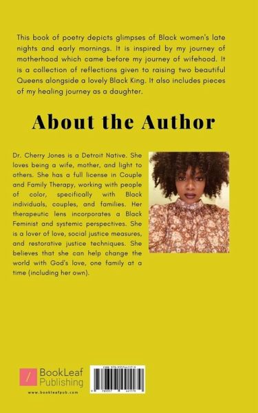 This book of poetry depicts glimpses of Black women's late nights and early mornings. It is inspired by my journey of motherhood which came before my journey of wifehood. It is a collection of reflections given to raising two beautiful Queens alongside a lovely Black King. It also includes pieces of my healing journey as a daughter.