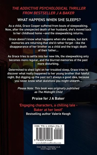 The addictive psychological thriller from top 50 bestselling author J A Baker! A long-ago trauma and a family mystery may shed light on her troubled sleep-or pull her into the darkness once and for all . . . As a child, Grace Cooper suffered from bouts of sleepwalking. Now, after the unexpected death of her husband, she's moved back to Woodburn Cottage, her childhood home-and the sleepwalking returns. Grace doesn't know what she does in her sleep, but it's stirring up dark memories that Grace would rather forget. Like the disappearance of her brother Simon as child and the tragic death of her father... Grace tries to settle into her new life, but with the passage of time, the sleepwalking only becomes more regular, and the blurred memories of the past only become more disturbing. Spurred on by these hazy dreamlike recollections, Grace becomes determined to find out what happened to Simon that fateful night. But digging up the past isn't always a good idea, because you never know what skeletons you might unearth... Please Note: This book was originally published as The Midniight Child A gripping psychological thriller that will keep you on the edge of your seat. Perfect for fans of Valerie Keogh, Diana Wilkinson and Keri Beevis. What people are saying about J.A.Baker "Engaging characters, a chilling tale - Baker at her best!" Bestselling author Valerie Keogh. "A dark and twisting thrill ride that asks the question: how well do you really know your parents? It kept me hooked until the final page!" Bestselling author M.A. Hunter. "A dark and twisty thriller that keep you guessing at the truth, The Perfect Parents is an addictive read!" Bestselling author Alison Stockham. "This captivating pacy thriller sucks you in from the first page and spits you out at the last! I thought I'd worked it out, but no... the twists kept coming and the final reveal is a heartbreaker