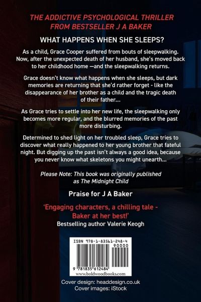 The addictive psychological thriller from top 50 bestselling author J A Baker! A long-ago trauma and a family mystery may shed light on her troubled sleep-or pull her into the darkness once and for all . . . As a child, Grace Cooper suffered from bouts of sleepwalking. Now, after the unexpected death of her husband, she's moved back to Woodburn Cottage, her childhood home-and the sleepwalking returns. Grace doesn't know what she does in her sleep, but it's stirring up dark memories that Grace would rather forget. Like the disappearance of her brother Simon as child and the tragic death of her father... Grace tries to settle into her new life, but with the passage of time, the sleepwalking only becomes more regular, and the blurred memories of the past only become more disturbing. Spurred on by these hazy dreamlike recollections, Grace becomes determined to find out what happened to Simon that fateful night. But digging up the past isn't always a good idea, because you never know what skeletons you might unearth... Please Note: This book was originally published as The Midniight Child A gripping psychological thriller that will keep you on the edge of your seat. Perfect for fans of Valerie Keogh, Diana Wilkinson and Keri Beevis. What people are saying about J.A.Baker "Engaging characters, a chilling tale - Baker at her best!" Bestselling author Valerie Keogh. "A dark and twisting thrill ride that asks the question: how well do you really know your parents? It kept me hooked until the final page!" Bestselling author M.A. Hunter. "A dark and twisty thriller that keep you guessing at the truth, The Perfect Parents is an addictive read!" Bestselling author Alison Stockham. "This captivating pacy thriller sucks you in from the first page and spits you out at the last! I thought I'd worked it out, but no... the twists kept coming and the final reveal is a heartbreaker