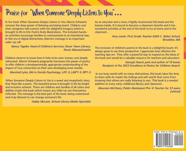Marcie has been enchanting young children and educating their parents for the past 40 years. She attended Clark University, earning degrees in special education and psychology, and went on to pursue her graduate studies in early childhood education at Tufts University and Wheelock College.Marcie's picture book When Someone Deeply Listens to You, is the culmination of Marcie's certification in poetic medicine. Marcie carries her skill and enthusiastic style into poetry circles she designs, to meet the needs of numerous populations. These include children, diversely abled adults, parents, and seniors.Marcie's first book, Parenting with Awareness, evolved from her experiences in teaching hundreds of parents and children in the Marcie and Me parent child program she created. The book offers a unique parenting philosophy that honors the integrity of childhood, with the goal to create children who are self-empowered, self-disciplined, and self-motivated.Because children learn through experimentation, both books contain creative hands-on activities and guided conversations to teach their vital message.Marcie lives with her husband in Massachusetts. When she isn't writing she may be doing numerology readings, photographing treasures of Cape Cod, or riding her bike along the bike path over the Sippewissett marsh in Falmouth, Massachusetts. She is the proud mother of two sons and three stepchildren. She is adoring her role as "Mimi" with her grandchildren.Marcie is available to organize an interactive workshop for your school or organization or to speak about her unique parenting philosophy. Follow Marcie on Instagram @marciebschwartz20 or email marcie@marcieschwartz.com.