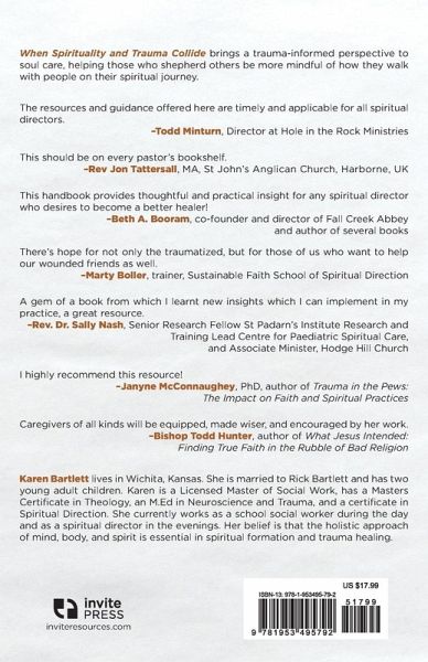 No part of us is unaffected by trauma. Our mind, our body, and our spirit - especially our ability to experience God as loving and good - are wounded when we face pain, abuse, and suffering. Yet, as spiritual leaders, we are often unaware of the ways trauma impacts the spiritual life - and how many of our well-intentioned responses can actually be hurtful for someone who has experienced trauma. Social worker and spiritual director Karen Bartlett has been there many times before. This led her to seminary to study theology and a master's program to study neuroscience - all to better understand how trauma impacts our view of God. When Spirituality and Trauma Collide brings together her learnings and breaks them down into a simple field guide that will equip you to respond to trauma in spiritual formation settings without inflicting harm.