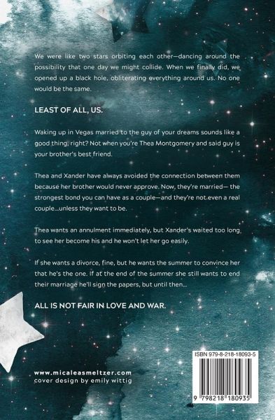 We were like two stars orbiting each other-dancing around the possibility that one day we might collide. When we finally did, we opened up a black hole, obliterating everything around us. No one would be the same. Least of all, us. Waking up in Vegas married to the guy of your dreams sounds like a good thing, right? Not when you're Thea Montgomery and said guy is your brother's best friend. Thea and Xander have always avoided the connection between them because her brother would never approve. Now, they're married- the strongest bond you can have as a couple-and they're not even a real couple...unless they want to be. Thea wants an annulment immediately, but Xander's waited too long to see her become his and he won't let her go easily. If she wants a divorce, fine, but he wants the summer to convince her that he's the one. If at the end of the summer she still wants to end their marriage he'll sign the papers, but until then... All is not fair in love and war.