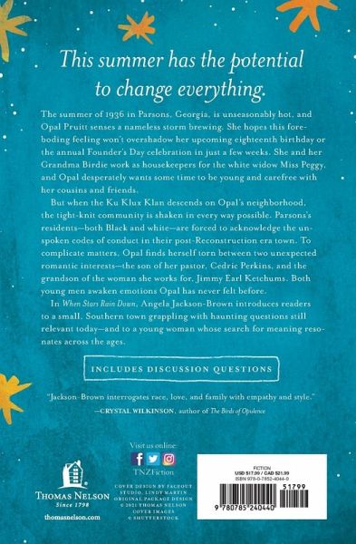 Opal is an eighteen-year-old Black woman working as a housekeeper in a small Southern town in the 1930s--and then the Klan descends. A moving story that confronts America's tragic past, When Stars Rain Down is both heartwarming and heart-wrenching. The summer of 1936 in Parsons, Georgia, is unseasonably hot, and Opal Pruitt senses a nameless storm brewing. She hopes this foreboding feeling won't overshadow her upcoming 18th birthday or the annual Founder's Day celebration in just a few weeks. She and her Grandma Birdie work as housekeepers for the white widow Miss Peggy, and Opal desperately wants some time to be young and carefree with her cousins and friends. But when the Ku Klux Klan descends on Opal's neighborhood, the tight-knit community is shaken in every way possible. Parsons's residents--both Black and white--are forced to acknowledge the unspoken codes of conduct in their post-Reconstruction era town. To complicate matters, Opal finds herself torn between two unexpected romantic interests--the son of her pastor, Cedric Perkins, and the white grandson of the woman she works for, Jimmy Earl Ketchums. Faced with love, loss, and a harsh awakening to an ugly world, Opal holds tight to her family and faith--and the hope for change. "When Stars Rain Down is so powerful, timely, and compelling . . . an important and beautifully written must-read of a novel." --Silas House, author of Southernmost * 2021 Langum Prize in American Historical Fiction - Finalist * Stand-alone novel * Includes discussion questions for book clubs