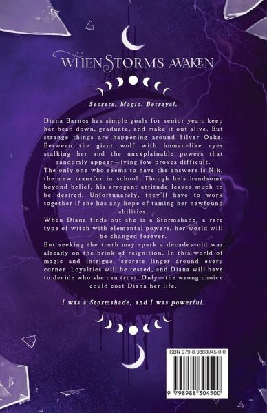 Secrets. Magic. Betrayal. Diana Barnes has simple goals for senior year: keep her head down, graduate, and make it out alive. But strange things are happening around Silver Oaks. Between the giant wolf with human-like eyes stalking her and the unexplainable powers that randomly appear-lying low proves difficult. The only one who seems to have the answers is Nik, the new transfer in school. Though he's handsome beyond belief, his arrogant attitude leaves much to be desired. Unfortunately, they'll have to work together if she has any hope of taming her newfound abilities. When Diana finds out she is a Stormshade, a rare type of witch with elemental powers, her world will be changed forever. But seeking the truth may spark a decades-old war already on the brink of reignition. In this world of magic and intrigue, secrets linger around every corner. Loyalties will be tested, and Diana will have to decide who she can trust. Only-the wrong choice could cost Diana her life. I was a Stormshade, and I was powerful.