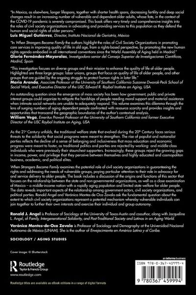 As the 21st Century unfolds, the traditional welfare state that evolved during the 20th Century faces serious threats to the solidarity that social programs were meant to strengthen. The rise of populist and nationalist parties reflects the decline of a sense of belonging and inclusiveness that mass education and economic progress were meant to foster, as traditional politics and parties are rejected by working- and middle-class individuals who were previously their staunchest supporters. Increasingly, these groups reject the growing gaps in income, power, and privilege that they perceive between themselves and highly educated and cosmopolitan business, academic, and political elites. When Strangers Become Family examines the potential role of civil society organizations in guaranteeing the rights and addressing the needs of vulnerable groups, paying particular attention to their role in advocacy for and service delivery to older people. The book includes a discussion of the origins and functions of this sector that focuses on the relationship between the state and non-governmental organizations, as well as a close examination of Mexico - a middle-income nation with a rapidly aging population and limited state welfare for older people. The data reveals important aspects of the relationship among government actors, civil society organizations, and political parties. Ronald Angel and Verónica Montes-de-Oca Zavala ask the fundamental question about the extent to which civil society organizations represent a potential mechanism whereby vulnerable individuals can join together to further their own interests and exercise their individual and group autonomy.