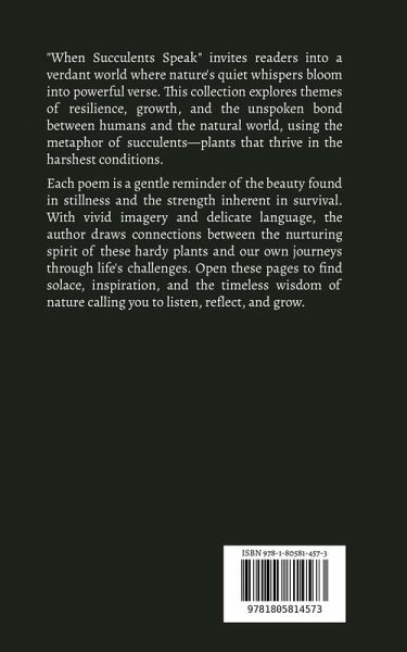 "When Succulents Speak" invites readers into a verdant world where nature's quiet whispers bloom into powerful verse. This collection explores themes of resilience, growth, and the unspoken bond between humans and the natural world, using the metaphor of succulents-plants that thrive in the harshest conditions. Each poem is a gentle reminder of the beauty found in stillness and the strength inherent in survival. With vivid imagery and delicate language, the author draws connections between the nurturing spirit of these hardy plants and our own journeys through life's challenges. Open these pages to find solace, inspiration, and the timeless wisdom of nature calling you to listen, reflect, and grow.