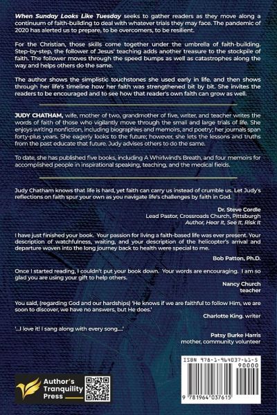 W hen Sunday Looks Like Tuesday seeks to gather readers as they move along a continuum of faith-building to deal with whatever trials they may face. The pandemic of 2020 has alerted us to prepare, to be overcomers, to be resilient. For the Christian, those skills come together under the umbrella of faith-building. Step-by-step, the follower of Jesus' teaching adds another treasure to the stockpile of faith. The follower moves through the speed bumps as well as catastrophes along the way and helps others do the same. The author shows the simplistic touchstones she used early in life. and then shows through her life's timeline how her faith was strengthened bit by bit. She invites the readers to be encouraged and to see how that reader's own faith can grow as well.