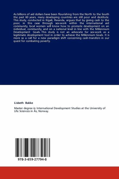 As billions of aid dollars have been flourishing from the North to the South the past 60 years, many developing countries are still poor and destitute. This study, conducted in Kigali, Rwanda, argues that by giving cash to the poor, in this case through sex-work within the international aid community, local women will know how to promote development on an individual, community, and on a national level in line with the Millennium Development Goals. This study is not an advocate for sex-work as a legitimate development tool in order to achieve the Millennium Goals. It is more so a call for a new paradigm shift concerning cash-transfers in our quest for combating poverty.