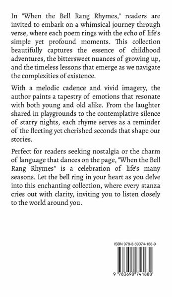 In "When the Bell Rang Rhymes," readers are invited to embark on a whimsical journey through verse, where each poem rings with the echo of life's simple yet profound moments. This collection beautifully captures the essence of childhood adventures, the bittersweet nuances of growing up, and the timeless lessons that emerge as we navigate the complexities of existence. With a melodic cadence and vivid imagery, the author paints a tapestry of emotions that resonate with both young and old alike. From the laughter shared in playgrounds to the contemplative silence of starry nights, each rhyme serves as a reminder of the fleeting yet cherished seconds that shape our stories. Perfect for readers seeking nostalgia or the charm of language that dances on the page, "When the Bell Rang Rhymes" is a celebration of life's many seasons. Let the bell ring in your heart as you delve into this enchanting collection, where every stanza cries out with clarity, inviting you to listen closely to the world around you.