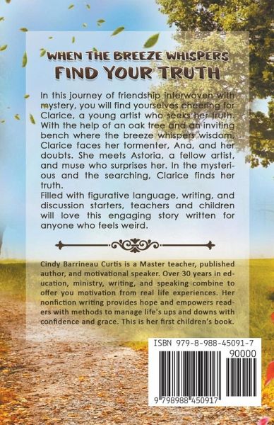 If you have ever been bullied or been the bully, this book is for you! When the Breeze Whispers Find Your Truth The Velveteen Rabbit meets The Giving Tree in this poignant tale. Through this journey of friendship interwoven with mystery, you will find yourself cheering for Clarice, a young artist, who seeks to find her truth. With the help of an oak tree and an inviting bench where the breeze whispers wisdom, Clarice finds her courage. She stands up to her tormenter, Ana, and faces her self doubts. When she writes to the tree for advice, she hides her note in a secret place. She meets Astoria, a fellow artist and muse, who finds the note and is full of surprises. In the mysterious, and in the searching, Clarice finds her truth and her friends. Filled with figurative language, writing and discussion starters, teachers and children who feel misunderstood and unaccepted will love this engaging story.personification bullying believe in yourself creativity writers artists scientists truth friendship