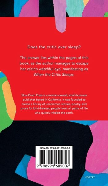 Does the critic ever sleep? The answer lies within the pages of this debut poetry collection, as author Pear Urushima manages to escape her critic's watchful eye. The poems in When the Critic Sleeps explore the edges of Urushima's life-some scary, some peculiar, some humorous. With a plainspoken, heart-to-heart tone, she confronts both her saboteur and the paranoia brought on by her persistent nitpicker. Meant to be read in one sitting and revisited for inspiration, When the Critic Sleeps offers an invitation to those seeking a quiet diversion from their own relentless, niggling censors. About Slow Drum Press. This book humbly and proudly joins the category of poetry by Asian American authors. It also marks the first publication from Slow Drum Press, a woman-owned, small-business publisher based in California. Slow Drum Press was founded to create a library of uncommon stories, poetry, and prose for kind-hearted people from unique horizons.