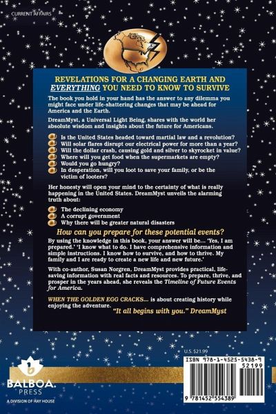 REVELATIONS FOR A CHANGING EARTH AND EVERYTHING YOU NEED TO KNOW TO SURVIVE The book you hold in your hand has the answer to any dilemma you might face under life-shattering changes that may be ahead for America and the Earth. DreamMyst, a Universal Light Being, shares with the world her absolute wisdom and insights about the future for Americans. • Is the United States headed toward martial law and a revolution? • Will solar flares disrupt our electrical power for more than a year? • Will the dollar crash, causing gold and silver to skyrocket in value? • Where will you get food when the supermarkets are empty? • Would you go hungry? • In desperation, will you loot to save your family, or be the victim of looters? Her honesty will open your mind to the certainty of what is really happening in the United States. DreamMyst unveils the alarming truth about: • The declining economy • A corrupt government • Why there will be greater natural disasters How can you prepare for these potential events? By using the knowledge in this book, your answer will be... ‘Yes, I am prepared.’ ‘I know what to do. I have comprehensive information and simple instructions. I know how to survive, and how to thrive. My family and I are ready to create a new life and new future.’ With co-author, Susan Norgren, DreamMyst provides practical, lifesaving information with real facts and resources. To prepare, thrive, and prosper in the years ahead, she reveals the Timeline of Future Events for America. WHEN THE GOLDEN EGG CRACKS... is about creating history while enjoying the adventure. "It all begins with you." DreamMyst