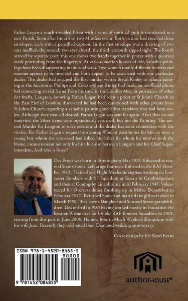 Father Logan a much-troubled Priest with a sense of spiritual guilt is transferred to a new Parish. Soon after his arrival two Murders occur. Both victims had received three envelopes, each with a pencilled caption. In the first envelope was a drawing of two ears muffled, the second, two eyes closed, the third, a mouth zipped tight. The fourth arrived by separate post; this one shows two hands together in prayer with a question mark protruding from the fingertips. At various auction houses of late, valuable paintings have been disappearing in unusual ways. Two women totally different in dress and manner appear to be involved and both appear to be associated with one particular dealer. This dealer had engaged the first murder victim Bryan Kinley to value a painting at the Auction at Phillips and Cowan where Kinley had made an unofficial phone bid Contacting an old friend from his time in the London Met, in pursuance of other Art thefts, Langton, knowing Father Logan had been a priest at St.John's Church in the East End of London, discovered he had been questioned with other priests from St.Johns Church regarding a valuable painting and Silver Artefacts that had been stolen. Although they were all cleared, Father Logan was sent for again. After that second interview the Silver items were mysteriously returned, but not the Painting. The second Murder for Langton to solve occurs and the dealer has some connection with the victim. For Father Logan a request by a young Woman parishioner for him to trace a young boy whom she witnessed had killed his father for whom his mother took the blame, creates tension not only for him but also between Langton and his Chief Superintendent, And who is Rosie?