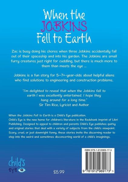 Zac is busy doing his chores when three Jobkins accidentally fall out of their spaceship and into his garden. The Jobkins are small furry creatures just right for cuddling, but there is much more to them than meets the eye ... Jobkins is a fun story about helpful aliens who find solutions to engineering and construction problems.
