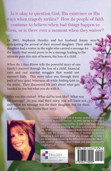 Is it okay to question God, His existence or His ways when tragedy strikes? How do people of faith continue to believe when bad things happen to them, or is there ever a moment when they waiver? In 2001, Stephanie Hensley and her husband Jimmy were anticipating the arrival of their second daughter. Their oldest daughter had a visitor in the night who carried a message for the family that would prove to be a message leading to the ultimate pain this side of heaven, the loss of a child. When the Lilacs Bloom tells the powerful story of one family's journey through the loss of a child, financial ruin and real marital struggles that would test anyone's faith. This story takes you through their path of loss, grief, bitterness all while finding faith in the midst. They discovered life isn't about what gets handed to you but what you do with it. Who was this visitor? What did he look like? What was his message? As you read their story, you will learn not only what his message was for their daughter, but for them and everyone who learns their story.