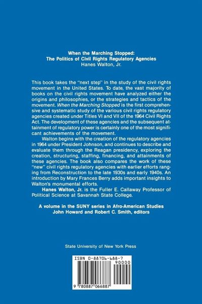 This book takes the "next step" in the study of the civil rights movement in the United States. To date, the vast majority of books on the civil rights movement have analyzed either the origins and philosophies, or the strategies and tactics of the movement. When the Marching Stopped is the first comprehensive and systematic study of the various civil rights regulatory agencies created under Titles VI and VII of the 1964 Civil Rights Act. The development of these agencies and the subsequent attainment of regulatory power is certainly one of the most significant achievements of the movement. Walton begins with the creation of the regulatory agencies in 1964 under President Johnson, and continues to describe and evaluate them through the Reagan presidency, exploring the creation, structuring, staffing, financing, and attainments of these agencies. The book also compares the work of these "new" civil rights regulatory agencies with earlier efforts ranging from Reconstruction to the late 1930s and early 1940s. An introduction by Mary Frances Berry adds important insights to Walton's monumental efforts.