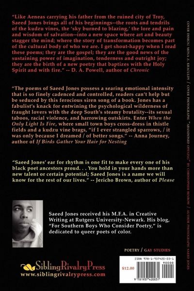 In his debut chapbook of poetry, Saeed Jones walks on the periphery of the South, those places on the outskirts of town, in bars after midnight, and on dangerous backroads where most people keep their heads down or look the other way. Through Texas and Tennessee, Alabama and the riverbeds of the Mississippi, these poems wrap themselves in cloaks of masks and comfort; garments we learn are flammable if we stand too close to flames. D. A. Powell says of Saeed's work, "Like Aeneas carrying his father from the ruined city of Troy, Saeed Jones brings all of his beginnings--the roots and tendrils of the kudzu vines, the 'sky burned to blazing,' the lore and pain and wisdom of salvation--into a new space where art and beauty stagger the mind; where the story of transformation becomes part of the cultural body of who we are. I get shout-happy when I read these poems; they are the gospel; they are the good news of the sustaining power of imagination, tenderness and outright joy; they are the birth of a new poetry that baptizes with the Holy Spirit and with fire."