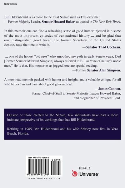 Bill Hildenbrand is as close to the total Senate man as I've ever met. -Former Majority Leader, Senator Howard Baker, as quoted in The New York Times. In this memoir one can find a refreshing sense of good humor injected into some of the most important episodes of our national history...and be glad that our distinguished good friend, the former Secretary of the United States Senate, took the time to write it. -Senator Thad Cochran. ... one of the honest "old pros" who smoothed my path in early Senate years. Dad [former Senator Milward Simpson] always referred to Bill as "one of nature's noble men." He is that. His memories as jogged here are special reading. -Former Senator Alan Simpson. A must-read memoir packed with humor and insight, and a valuable critique for all who believe in and care about good government. -James Cannon, former Chief-of-Staff to Senate Majority Leader Howard Baker, and biographer of President Ford.