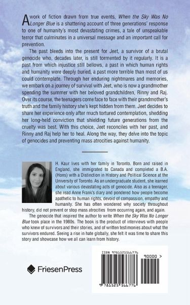 H. Kaur lives with her family in Toronto. Born and raised in England, she immigrated to Canada and completed a B.A. (Hons) with a Distinction in History and Political Science at the University of Toronto. As an undergraduate student, she learned about various devastating acts of genocide. Also as a teenager, she read Anne Frank's diary and pondered how people become apathetic to human rights, devoid of compassion, empathy and humanity. She has often wondered why society throughout history, did not prevent or stop mass atrocities from occurring again, and again. The genocide that inspired the author to write When the Sky Was No Longer Blue took place in the 1980s. The book is the product of interviews with people who knew of survivors and their stories, and of written testimonies about what the survivors endured. Seeing a rise in hate globally, she felt it was time to share this story and showcase how we all can learn from history.