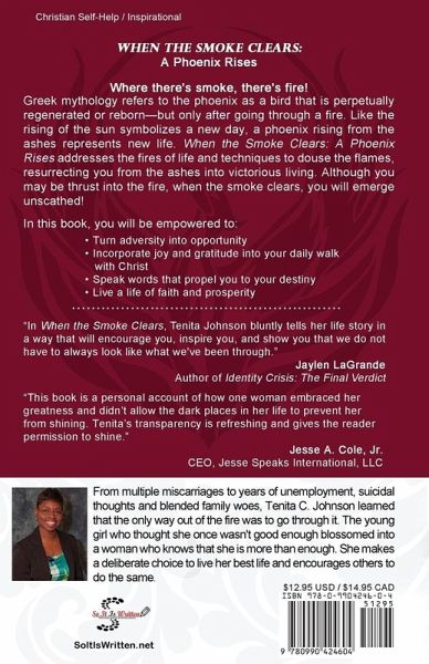 When the Smoke Clears: A Phoenix Rises Greek Mythology refers to the phoenix as a bird that is perpetually regenerated or reborn-but only after going through a fire. Like the rising of the sun symbolizes a new day, a phoenix rising from the ashes represents new life. When the Smoke Clears: A Phoenix Rises addresses the fires of life and techniques to douse the flames, resurrecting you from the ashes into victorious living. Although you may be thrust into the fire, when the smoke clears, you will emerge unscathed! In this book, you will be empowered to: ~ Turn adversity into opportunity ~ Incorporate joy and gratitude into your daily walk with Christ ~ Speak words that propel you to your destiny ~ Live a life of faith and prosperity