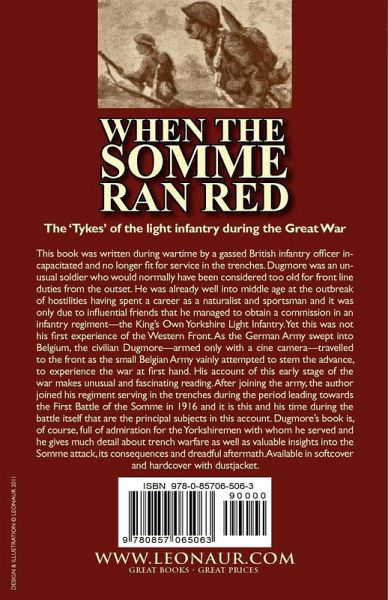The 'Tykes' of the light infantry during the Great War This book was written during wartime by a gassed British infantry officer incapacitated and no longer fit for service in the trenches. Dugmore was an unusual soldier who would normally have been considered too old for front line duties from the outset. He was already well into middle age at the outbreak of hostilities having spent a career as a naturalist and sportsman and it was only due to influential friends that he managed to obtain a commission in an infantry regiment-the King's Own Yorkshire Light Infantry. Yet this was not his first experience of the Western Front. As the German Army swept into Belgium, the civilian Dugmore-armed only with a cine camera-travelled to the front as the small Belgian Army vainly attempted to stem the advance, to experience the war at first hand. His account of this early stage of the war makes unusual and fascinating reading. After joining the army, the author joined his regiment serving in the trenches during the period leading towards the First Battle of the Somme in 1916 and it is this and his time during the battle itself that are the principal subjects in this account. Dugmore's book is, of course, full of admiration for the Yorkshiremen with whom he served and he gives much detail about trench warfare as well as valuable insights into the Somme attack, its consequences and dreadful aftermath. Available in softcover and hardcover with dustjacket.