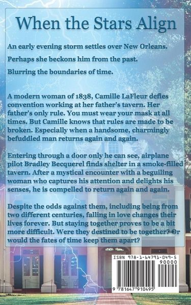 An early evening storm settles over New Orleans. Perhaps she beckons him from the past. Blurring the boundaries of time. A modern woman of 1838, Camille LaFleur defies convention working at her father's tavern. Her father's only rule. You must wear your mask at all times. But Camille knows that rules are made to be broken. Especially when a handsome, charmingly befuddled man returns again and again. Entering through a door only he can see, airplane pilot Bradley Becquerel finds shelter in a smoke-filled tavern. After a mystical encounter with a beguiling woman who captures his attention and delights his senses, he is compelled to return again and again. Despite the odds against them, including being from two different centuries, falling in love changes their lives forever. But staying together proves to be a bit more difficult. Were they destined to be together? Or would the fates of time keep them apart?