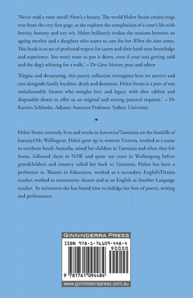 'Never read a verse novel? Here's a beauty. The world Helen Swain creates rings true from the very first page, as she explores the complexities of a carer's life with brevity, honesty, and wry wit. Helen brilliantly evokes the tensions between an ageing mother and a daughter who wants to care for her When the time comes. This book is an act of profound respect for carers and their hard-won knowledge and experience. You won't want to put it down, even if your tea's getting cold and the dog's whining for a walk.' - Dr Gina Mercer, poet and editor 'Elegiac and devastating, this poetry collection reimagines how we survive and care alongside family loyalties, death and dementia. Helen Swain is a poet of our unfathomable futures who mingles love and legacy with shot rabbits and disposable sheets to offer us an original and searing pastoral requiem.' - Dr Katrina Schlunke, Adjunct Associate Professor, Sydney University