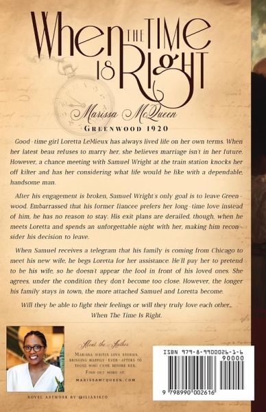 Greenwood 1920 Good-time girl Loretta LeMieux has always lived life on her own terms. When her latest beau refuses to marry her, she believes wedded bliss isn't in her future. However, a chance meeting with Samuel Wright at the train station knocks her off-kilter and has her considering what life would be like with a dependable, handsome man. After his engagement is broken, Samuel Wright's only goal is to leave Greenwood. Embarrassed that his former fiancée prefers her longtime love instead of him, he has no reason to stay. But his exit plans are derailed when he meets Loretta and spends an unforgettable night with her, making him reconsider his decision to leave. When Samuel receives a telegram that his family is coming from Chicago to meet his new wife, he begs Loretta for her assistance. He'll pay her to pretend to be his wife so he doesn't appear a fool in front of his loved ones. She agrees under the condition that they don't grow too close. However, the longer his family stays in town, the more attached Samuel and Loretta become. Will they be able to fight their feelings, or will they truly love each other... when the time is right?