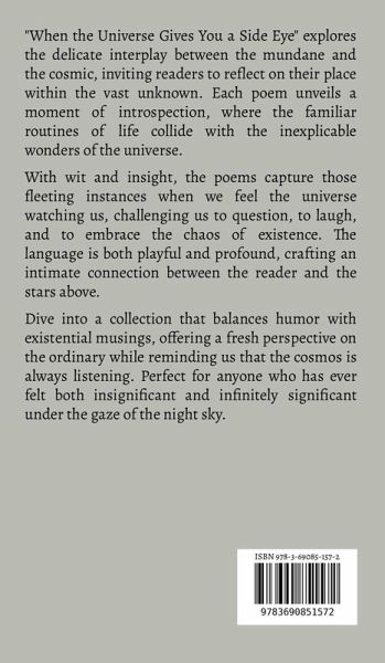 "When the Universe Gives You a Side Eye" explores the delicate interplay between the mundane and the cosmic, inviting readers to reflect on their place within the vast unknown. Each poem unveils a moment of introspection, where the familiar routines of life collide with the inexplicable wonders of the universe. With wit and insight, the poems capture those fleeting instances when we feel the universe watching us, challenging us to question, to laugh, and to embrace the chaos of existence. The language is both playful and profound, crafting an intimate connection between the reader and the stars above. Dive into a collection that balances humor with existential musings, offering a fresh perspective on the ordinary while reminding us that the cosmos is always listening. Perfect for anyone who has ever felt both insignificant and infinitely significant under the gaze of the night sky.