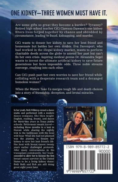 One kidney-three people must have it. Are some gifts so great they become a burden? Tyranny? Retired high school teacher CiCi Clawson-Dawson's one kidney filters lives forged together by chance and shredded by circumstance, leading to fraud, kidnapping, and murder. CiCi wants to donate her kidney to save her best friend and housemate but battles her own doubts. Eva Davenport, who had worked in the illegal kidney market, wants to perform charitable deeds across the globe to amend her past but can't fix her own crisis. Aspiring medical genius Dr. Alexandra Segel wants to invent the ultimate artificial kidney to save future generations but faces impossible odds. Three noble streams converge, crashing into each other. Can CiCi push past her own worries to save her friend while colliding with a desperate research team and a deranged homeless woman? When the Waters Take Us merges tough life and death choices into a story of friendship, deception, and brutal miracles. (346 pages)