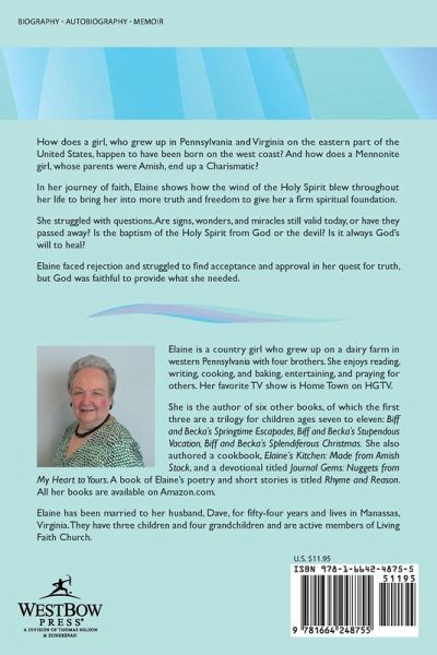 How does a girl, who grew up in Pennsylvania and Virginia on the eastern part of the United States, happen to have been born on the west coast? And how does a Mennonite girl, whose parents were Amish, end up a Charismatic? In her journey of faith, Elaine shows how the wind of the Holy Spirit blew throughout her life to bring her into more truth and freedom to give her a firm spiritual foundation. She struggled with questions. Are signs, wonders, and miracles still valid today, or have they passed away? Is the baptism of the Holy Spirit from God or the devil? Is it always God's will to heal? Elaine faced rejection and struggled to find acceptance and approval in her quest for truth, but God was faithful to provide what she needed.