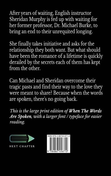 After years of waiting, English instructor Sheridan Murphy is fed up with waiting for her former professor, Dr. Michael Burke, to bring an end to their unrequited longing. She finally takes initiative and asks for the relationship they both want. But what should have been the romance of a lifetime is quickly derailed by the secrets each of them has kept from the other. Can Michael and Sheridan overcome their tragic pasts and find their way to the love they were meant to share? Because when the words are spoken, there's no going back. This book contains graphic sex and is not suitable for readers under the age of 18. This is the large print edition of When The Words Are Spoken, with a larger font / typeface for easier reading.