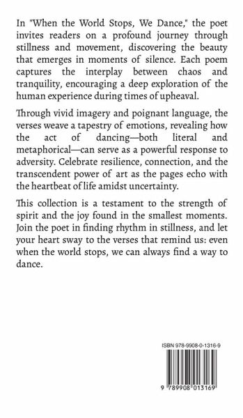 In "When the World Stops, We Dance," the poet invites readers on a profound journey through stillness and movement, discovering the beauty that emerges in moments of silence. Each poem captures the interplay between chaos and tranquility, encouraging a deep exploration of the human experience during times of upheaval. Through vivid imagery and poignant language, the verses weave a tapestry of emotions, revealing how the act of dancing-both literal and metaphorical-can serve as a powerful response to adversity. Celebrate resilience, connection, and the transcendent power of art as the pages echo with the heartbeat of life amidst uncertainty. This collection is a testament to the strength of spirit and the joy found in the smallest moments. Join the poet in finding rhythm in stillness, and let your heart sway to the verses that remind us: even when the world stops, we can always find a way to dance.