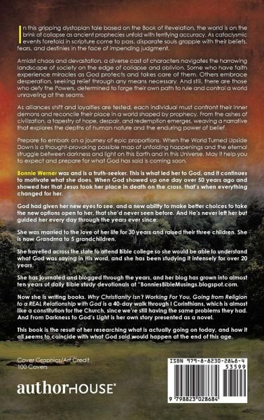 In this gripping dystopian tale based on the Book of Revelation, the world is on the brink of collapse as ancient prophecies unfold with terrifying accuracy. As cataclysmic events foretold in scripture come to pass, disparate souls grapple with their beliefs, fears, and destinies in the face of impending judgment. Amidst chaos and devastation, a diverse cast of characters navigates the harrowing landscape of society on the edge of collapse and oblivion. Some who have faith experience miracles as God protects and takes care of them. Others embrace desperation, seeking relief through any means necessary. And still, there are those who defy the Powers, determined to forge their own path to rule and control a world unraveling at the seams. As alliances shift and loyalties are tested, each individual must confront their inner demons and reconcile their place in a world shaped by prophecy. From the ashes of civilization, a tapestry of hope, despair, and redemption emerges, weaving a narrative that explores the depths of human nature and the enduring power of belief. Prepare to embark on a journey of epic proportions. When the World Turned Upside Down is a thought-provoking possible map of unfolding happenings and the eternal struggle between darkness and light on this Earth and in this Universe. May it help you to expect and prepare for what God has said is coming soon. Bonnie Werner was and is a truth-seeker. This is what led her to God, and it continues to motivate what she does. When God showed up one day over 50 years ago and showed her that Jesus took her place in death on the cross, that's when everything changed for her. God had given her new eyes to see, and a new ability to make better choices to take the new options open to her, that she'd never seen before. And He's never left her but guided her every day through the years ever since. She was married to the love of her life for 30 years and raised their three children. She is now Grandma to 5 grandchildren. She travelled across the state to attend Bible college so she would be able to understand what God was saying in His word, and she has been studying it intensely for over 20 years. She has journaled and blogged through the years, and her blog has grown into almost ten years of daily Bible study devotionals at "BonniesBibleMusings.blogspot.com. Now she is writing books. Why Christianity Isn't Working For You, Going from Religion to a REAL Relationship with God is a 40-day walk through I Corinthians, which is almost like a constitution for the Church, since we're still having the same problems they had. And From Darkness to God's Light is her own story presented as a novel. This book is the result of her researching what is actually going on today, and how it all seems to coincide with what God said would happen at the end of this age.