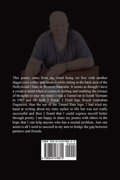 This poetry came from my mind being set free with another digger over coffee and smokes while sitting in the back area of the Hollywood Clinic in Western Australia. It seems as though I have a creative mind when it comes to writing and enabling the release of thoughts to ease my mind. I was a Tunnel rat in South Vietnam in 1967 and 68, with 3 Troop, 1 Field Sqn, Royal Australian Engineers, thus the use of the Tunnel Rats logo. I had tried my hand at writing about my time earlier in life but was not really successful and then I found that I could express myself better through poetry. I am happy to share my poems with others in the hope that I can help anyone who has a mental problem. Just one assist is all I need to succeed in my aim to bridge the gap between partners and friends.