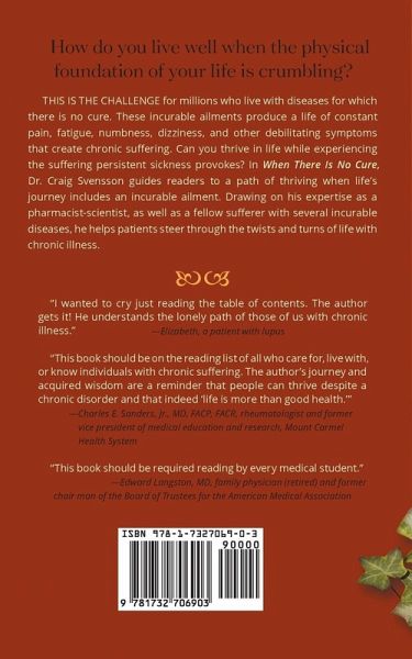I visited bookstores in my professional and personal travels across the country with a simple question to the booksellers: "What book would you recommend to someone diagnosed with an incurable, but not fatal, illness?" The frequent response was a perplexed look, sometimes accompanied by scratching the head or chin. At best, they directed me to books focused on living a healthy lifestyle-often through a diet plan of unproven value. A few pointed to books focused on a very specific disease. These invariably dealt with an unconventional and poorly supported approach to treatment. But the booksellers with whom I visited were at a loss for a book addressing the many issues faced by those of us living with incurable ailments leading to many years of an altered lifestyle: How do we get physicians to take our health complaints seriously? Where do we turn when doctors acknowledge our ailment with upturned hands and confess they don't know how to help? How do we deal with the overwhelming sense of loss with an untreatable diagnosis-one sure to produce profound changes in our life? How do we address those whose reaction to our ailment increases our suffering? Can we live well with inescapable pain? How do we avoid living in a state of fear when facing an uncertain prognosis? Should we try to keep our disease a secret from others? How do we choose between treatment options when each could cause harm? How do we tell if new symptoms are from our chronic disease or signs of some new ailment? How do we live with regret when an ailment is a result of choices we made? How can those who love us help? As a pharmacist and biomedical scientist living with several incurable ailments, I understand the travails patients with chronic illness face. I wrote to help patients and those who care for them find answers to these important questions. When There Is No Cure provides encouragement and hope to those navigating the troubled waters of chronic illness.