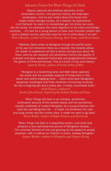 At 23, Matt Davis moved to a remote Mongolian town to teach English.What he found when he arrived was a town-and a country-undergoing wholesale change from a traditional, countryside existence to a more urban, modern identity. When Things Get Dark documents these changes through the Mongolians Matt meets, but also focuses on the author's downward spiral into alcohol abuse and violence--a scenario he saw played out by many of the Mongolian men around him. Matt's self-destruction culminates in a drunken fight with three men that forces him to a hospital to have his kidneys X-rayed. He hits bottom in that cold hospital room, his body naked and shivering, a bloodied Mongolian man staring at him from an open door, the irrational thought in his head that maybe he is going to die there. His personal struggles are balanced with insightful descriptions of customs and interactions, and interlaced with essays on Mongolian history and culture that make for a fascinating glimpse of a mysterious place and people.